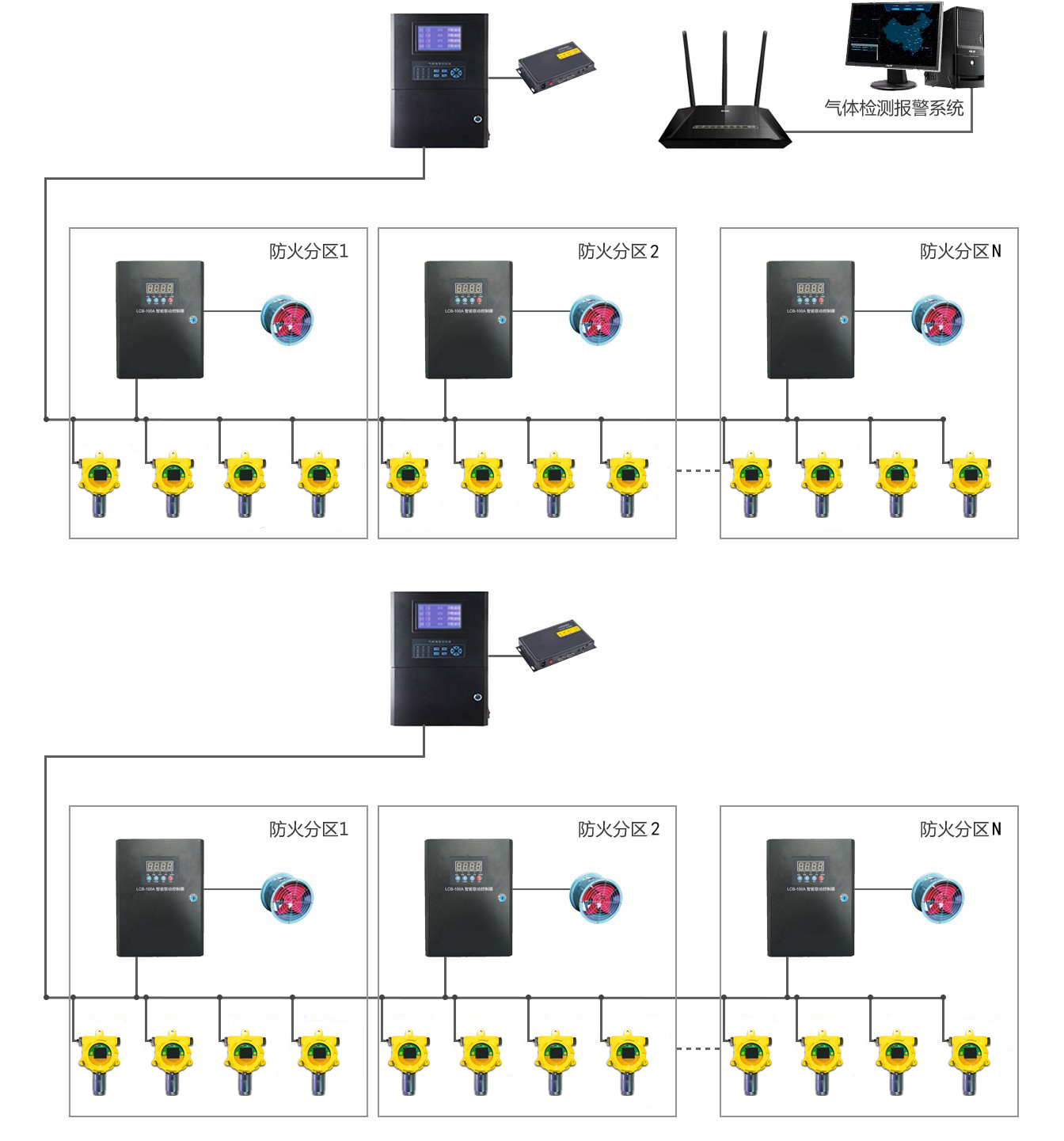 1)有线传输:气体控制器可输出RS485信号,经转换器转化成为RS232信号,传输到电脑终端。